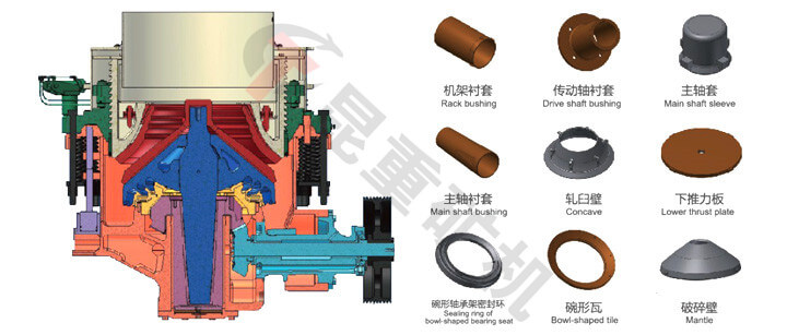 • 圓錐式破碎機配件 機架銅套、主軸銅套、軋(zhá)臼壁、破碎壁、碗形瓦、推力板、密封環、齒輪、固化劑、專用油等。