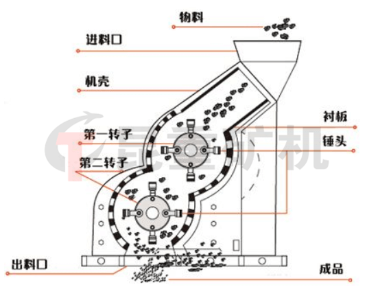 雙級破碎機工作時,在雙電機的帶動下(xià),上下結構雙轉子互相串連的兩套轉子同時高速旋轉,仰擊式雙(shuāng)重粉碎。腔內(nèi)錘(chuí)打物料在機內(nèi)腔(qiāng)經上(shàng)級(jí)轉子擊(jī)碎立即被飛速旋轉的下級轉子(zǐ)的錘頭再次細碎,內腔物料相互(hù)飛速碰撞、相互粉碎、達到錘粉料、料粉料的效果(guǒ),一次成形3毫米左右(yòu)的成品。排料口沒有篩(shāi)板篦條,混合料(liào)通過性能好,濕料不(bú)糊不堵。